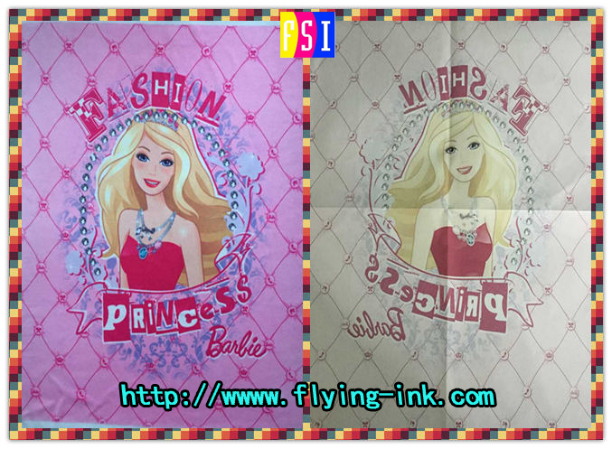 五、印刷工藝:用膠印機(jī)器將熱升華油墨印在雙膠紙(銅版紙)上,印出花紙;然后將花紙和布料一起放在熱轉(zhuǎn)印機(jī)器內(nèi),加熱180-220℃,加壓,時(shí)間15-20S,得出成品(油墨可直接上機(jī)使用,不需添加助劑)。